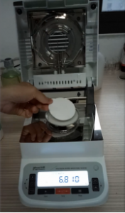 第一步、給測(cè)試儀接上電源,調(diào)整水平后. 在稱量盤上墊層玻璃纖維紙,按清零鍵.搖動(dòng)乳液以后 取3克左右鋪勻在盤中,按開(kāi)始測(cè)試,儀器根據(jù)失重率自動(dòng)停機(jī),此時(shí)屏幕上顯示的是水分值97.27%,再按單位鍵,可切換顯示為固含量值2.73%