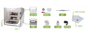 ①主機、②水槽、③測量臺、④鑷子、⑤說明書、⑥砝碼、⑦防風防塵罩、⑧測顆粒配件一套、⑨測浮體配件一套、⑩電源變壓器一個